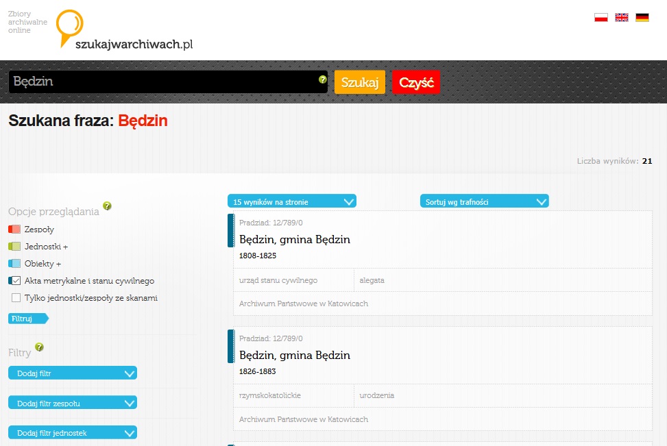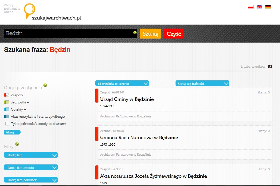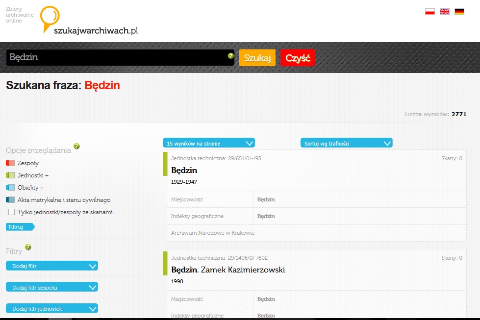 Informacje na ten temat możemy znaleźć na stronach poszczególnych archiwów albo na portalu szukajwarchiwach.pl, któremu się teraz przyjrzymy. Spróbujmy wpisać w wyszukiwarkę portalu hasło: „Będzin”. Otrzymamy 2771 rekordów. Ich liczba jest bardzo duża, ponieważ część inwentarzy została już wprowadzona do systemu. W wynikach wyszukiwania otrzymaliśmy więc nie tylko informacje o zespołach archiwalnych, ale również o jednostkach archiwalnych, które są już dostępne w systemie i zawierają w nazwie lub opisie słowo: „Będzin”.
