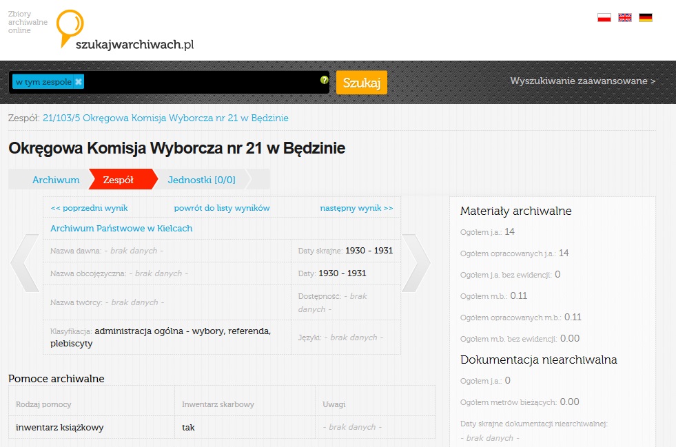 Niestety i tym razem nie udało się znaleźć poszukiwanych zespołów, ale w wynikach wyszukiwania moją uwagę zwróciła dokumentacja Okręgowej Komisji Wyborczej nr 21 w Będzinie z lat 1930–1931. Jeżeli w tym zespole znajdują się spisy wyborców, to mamy szansę znaleźć tam informacje na temat Stanisława Borkowskiego, gdyż w 1930 roku musiał mieć skończone 18 lat i prawo głosu. Po kliknięciu w rekord przejdziemy do metryki zespołu. Dowiemy się z niej, że zespół ten jest przechowywany w Archiwum Państwowym w Kielcach, posiada 14 jednostek oraz inwentarz. Nie jest to duży zespół. Największe mogą mieć nawet kilkanaście tysięcy jednostek. Pomimo że zespół ten jest tak mały, jego inwentarz nie został opublikowany na portalu. Nie pozostaje nam więc nic innego, jak tylko pojechać do Kielc i sprawdzić w inwentarzu, czy w tym zespole znajdują się jednostki archiwalne zawierające spis wyborców. Jeśli tak, to zamówimy właściwą jednostkę i spróbujemy w niej odnaleźć naszego Stanisława Borkowskiego (i pewnie jeszcze kilku innych Borkowskich).