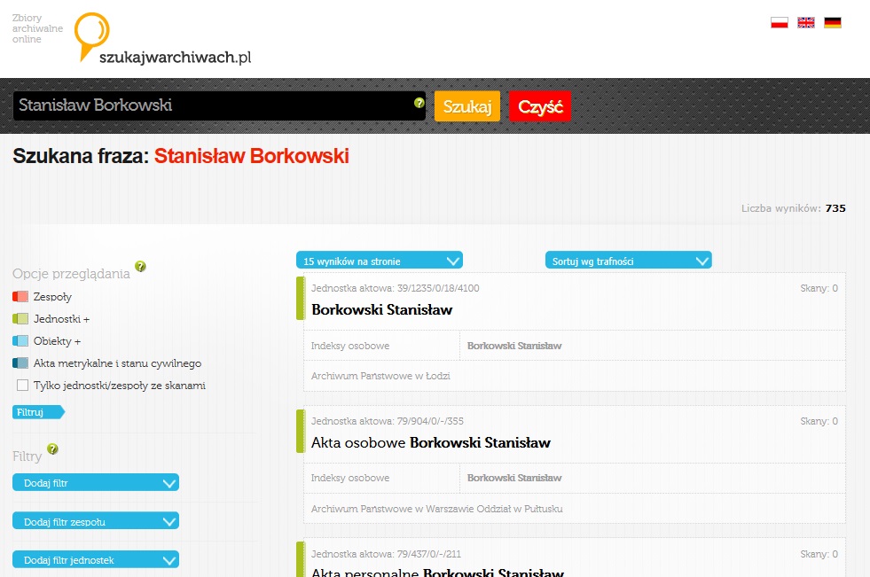 Znajdziemy dokładnie 735 jednostek. Zarówno imię, jak i nazwisko jest dość popularne, dlatego z pewnością większość tych jednostek dotyczy innych osób o tym samym imieniu i nazwisku. Należy więc zawęzić wyniki. Pamiętając o zasadzie pertynencji terytorialnej ograniczamy wyniki tylko do tych jednostek, które są przechowywane w najbliższych Będzinowi archiwach państwowych. Po lewej klikamy przycisk „dodaj filtr” i wybieramy filtr „archiwum”. Następnie zaznaczamy na liście odpowiednie archiwum. Po wybraniu częstochowskiego okazuje się, że w jego magazynach znajduje się 6 jednostek dotyczących Stanisława Borkowskiego. Po kliknięciu w każdy z tych rekordów możemy sprawdzić, w jakim zespole znajduje się dana jednostka. Niestety nie jesteśmy w stanie stwierdzić, czy któraś z nich dotyczy naszego Stanisława. Moglibyśmy się upewnić jadąc do Częstochowy w celu przeprowadzenia kwerend w tych materiałach. W analogiczny sposób sprawdziłem jeszcze Archiwum Państwowe w Katowicach. Tam jednak nie znalazłem żadnych jednostek, które mogą zawierać informacje o naszym bohaterze.