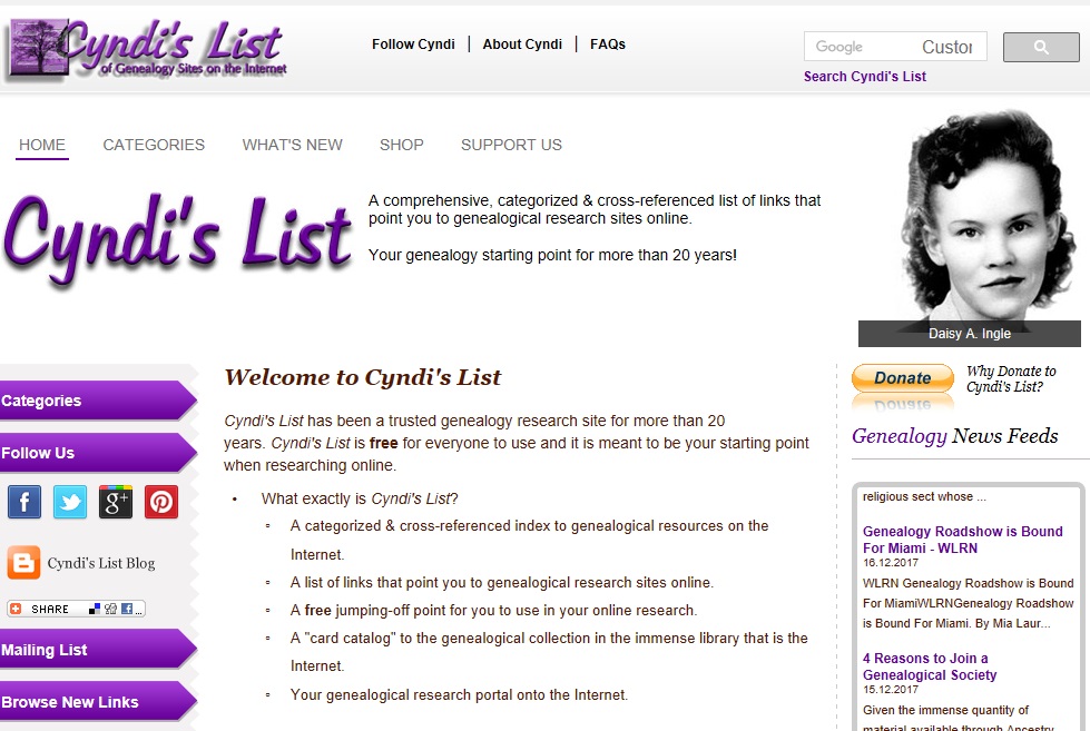 W internecie można znaleźć bardzo wiele stron prezentujących dane na temat mieszkańców różnych regionów świata. Opisanie ich wszystkich byłoby zadaniem karkołomnym, jeśli w ogóle możliwym. I jest to bezzasadne, ponieważ od przeszło 20 lat Cyndi Howells tworzy stronę zawierającą linki do innych stron genealogicznych – Cyndi's List (https://www.cyndislist.com/). Jak sama twierdzi, jest to jej główne zajęcie w życiu – pełen etat. Dzięki zebranym przez nią informacjom jesteśmy w stanie szybko dotrzeć do wielu ciekawych baz danych, których odnalezienie za pomocą wyszukiwarek, takich jak Google, byłoby bardzo trudne.