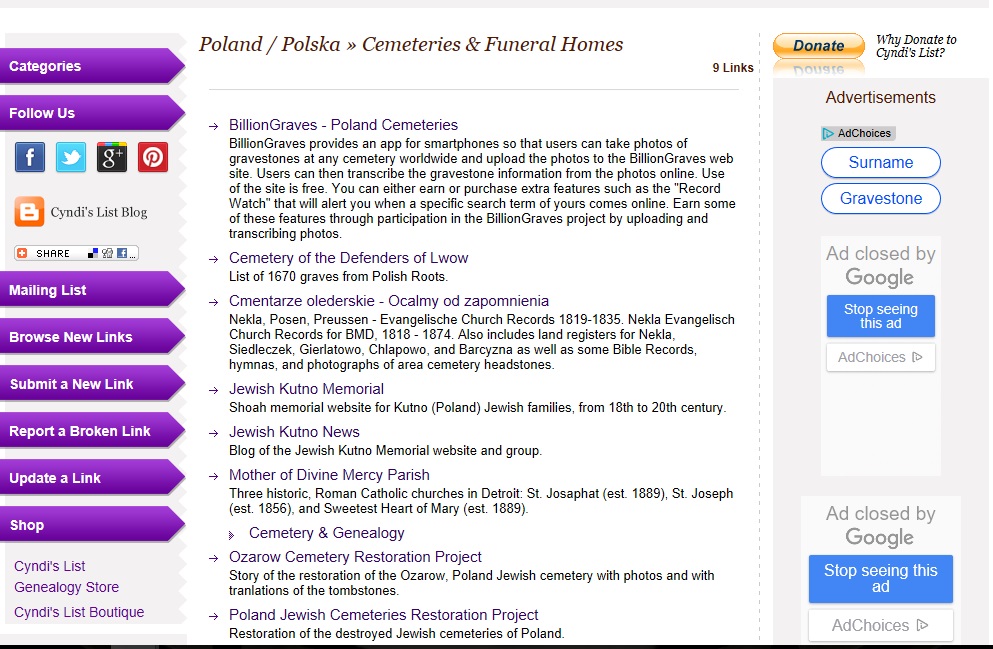 Pamiętajmy jednak, że Cyndi Howells przeszukuje internet w języku angielskim i przez to nie wszystkie bazy danych udaje się jej odnaleźć. Mimo to Cyndi przyporządkowała do kategorii „Polska” przeszło 400 baz danych i stron genealogicznych. Jest to bardzo pomocny zasób – warto sprawdzić, która z tych stron może zawierać potrzebne nam materiały.