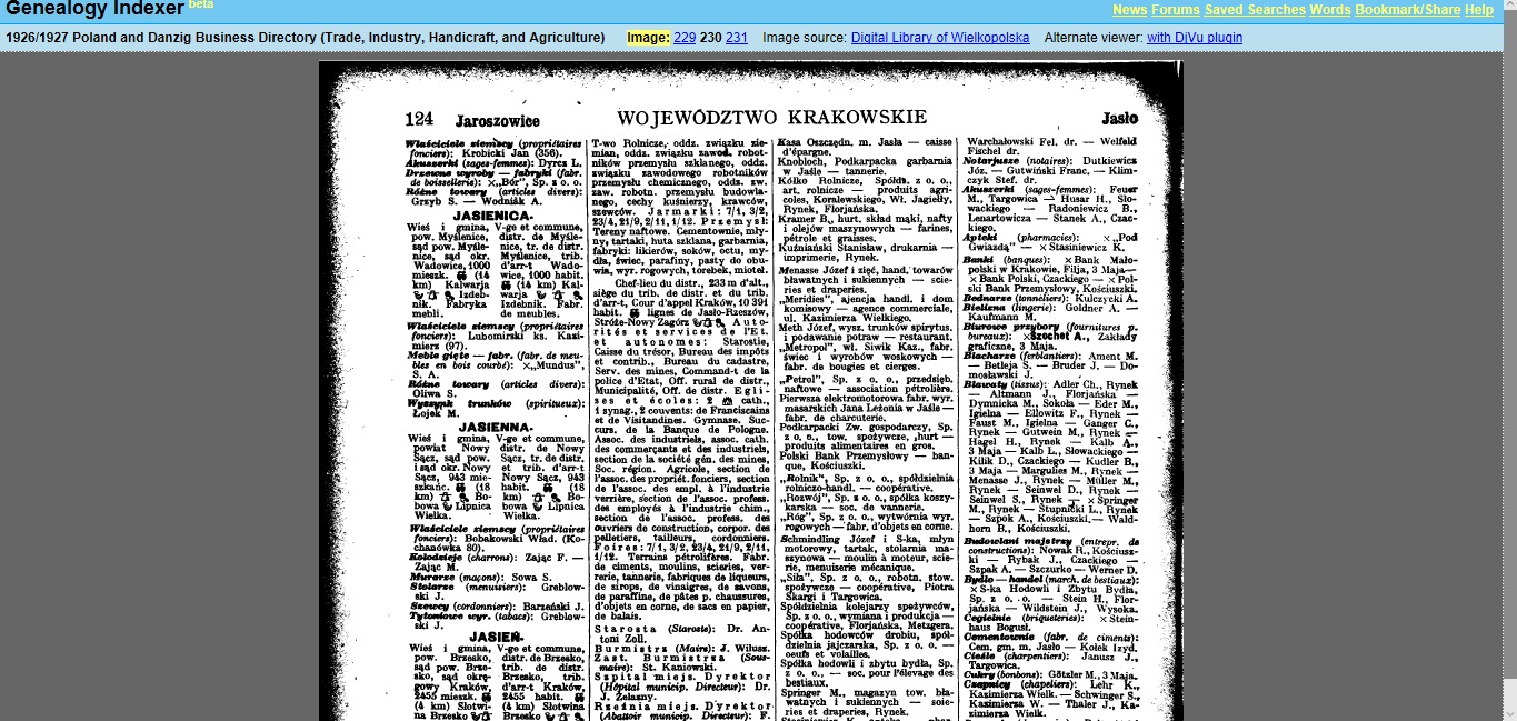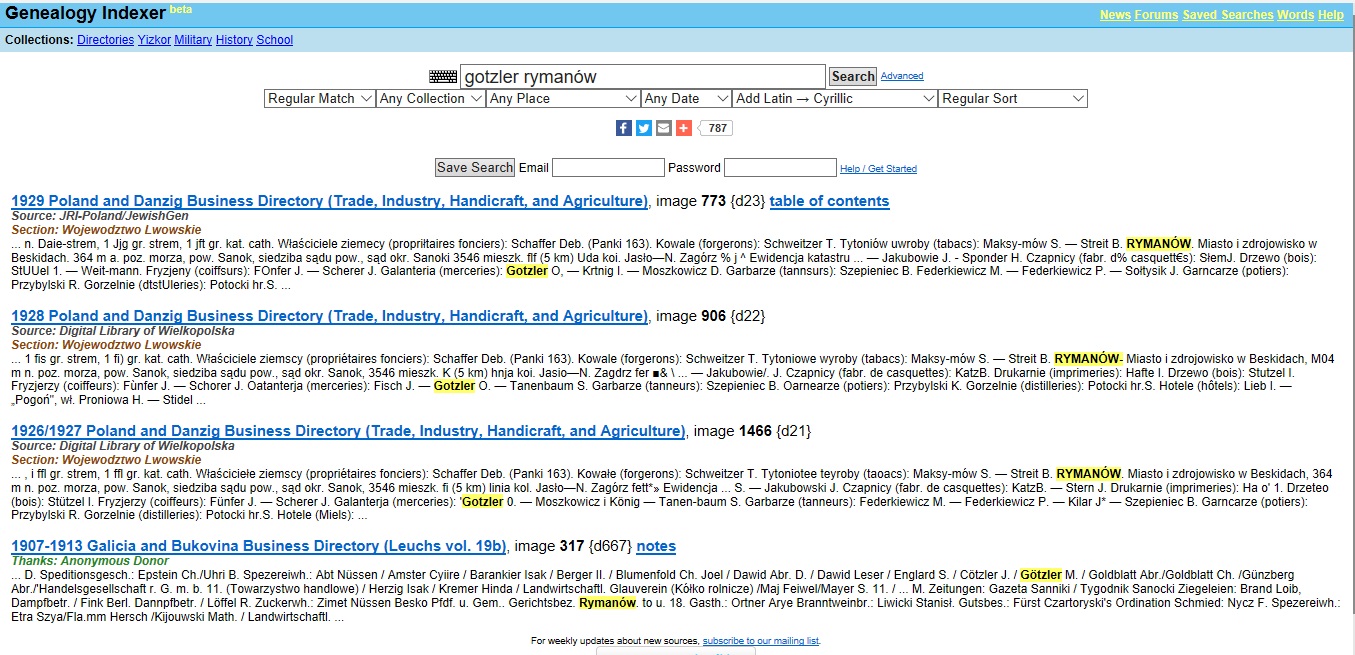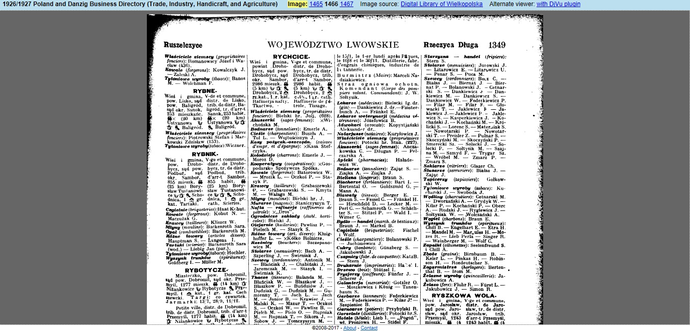 Wiele bibliotek cyfrowych używa formatu DjVu, więc warto wcześniej sprawdzić, czy mamy zainstalowaną na komputerze przeglądarkę plików w tym formacie. Jeżeli nie wystąpią problemy techniczne, odpowiednia strona internetowa szybko się nam wyświetli. Teraz wystarczy odszukać na niej interesujące nas nazwisko. W Rymanowie pojawia się wpis dotyczący „Gotzlera O.” – sprzedawcy „Galanterii”. Prawdopodobnie jest to ojciec naszego bohatera – Mosesa Gotzlera.