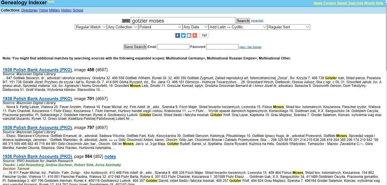 Jako że Moses Gotzler w 1926 r. miał około 13 lat, istnieje szansa, że w jakimś spisie z lat trzydziestych pojawi się już jako dorosły człowiek. Spróbujmy więc wpisać w pasku wyszukiwarki „Gotzler Moses” oraz zawęzić wyszukiwanie do Polski. W wynikach otrzymamy dużo więcej stron z różnych książek teleadresowych, na których występują nazwy „Gotzler” i „Moses”. Nazwy te nie muszą występować obok siebie, tzn. nie muszą dotyczyć jednej osoby. Zwracam też uwagę, że imię „Moses” można zapisać na kilka sposobów, np. „Mojżesz” lub „Mosiek”, a więc należałoby sprawdzić różne warianty. W naszym przypadku, pierwszy wyszukany rekord odnosi się do strony spisu kont bankowych PKO, na której pojawia się Grossfeld Moses Leib oraz Gotzler Isak. Strona ta ewidentnie nie dotyczy poszukiwanej przeze mnie osoby. Dlatego warto spróbować wpisać imię i nazwisko w cudzysłowie – zarówno w kombinacji „Moses Gotzler”, jak i „Gotzler Moses”. Dzięki temu wyszukamy strony z ksiąg teleadresowych, na których pojawia się to imię i nazwisko obok siebie.