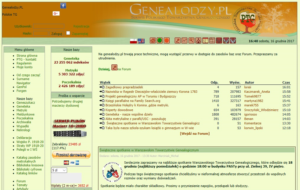 Portal genealodzy.pl jest jedną z najważniejszych baz danych z informacjami na temat osób mieszkających w Polsce. Baza ta na początku wydaje się dość skomplikowana i nieprzejrzysta, ale gdy zrozumiemy jej strukturę, stanie się ona bardzo pomocnym narzędziem w naszych poszukiwaniach. Portal powstał dzięki osobom skupionym wokół Polskiego Towarzystwa Genealogicznego. Jego członkowie pracują społecznie tworząc indeksy genealogiczne, czyli spisy imion i nazwisk występujących w różnego typu materiałach archiwalnych. Portal posiada kilka baz danych, za pomocą których możemy szukać naszych przodków. W tym miejscu skupimy się na jednej.