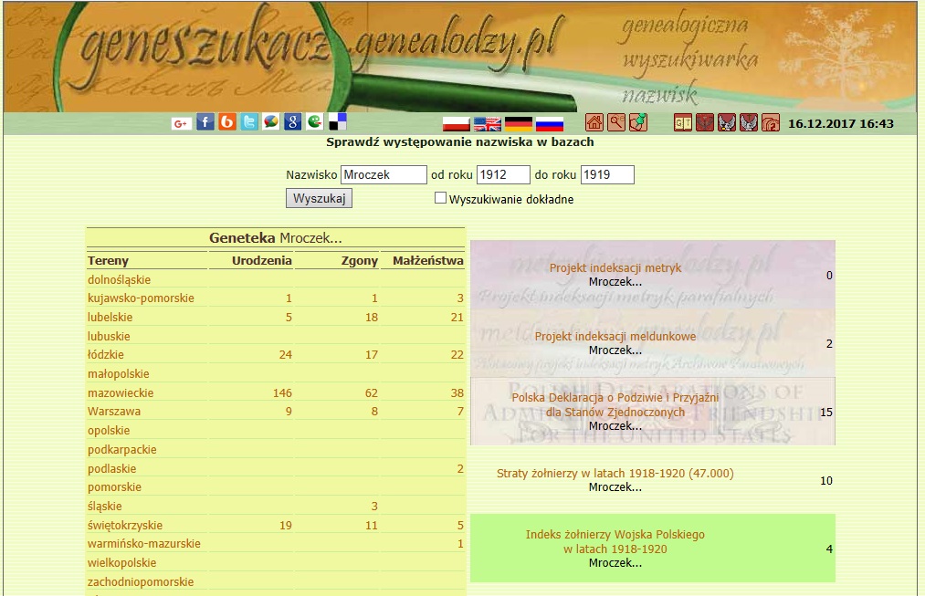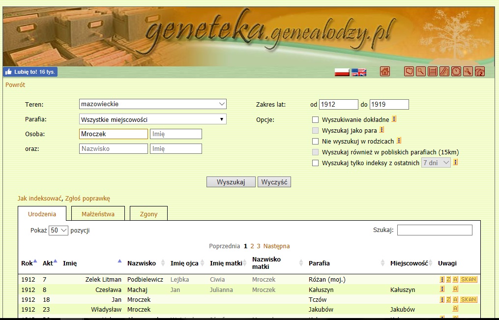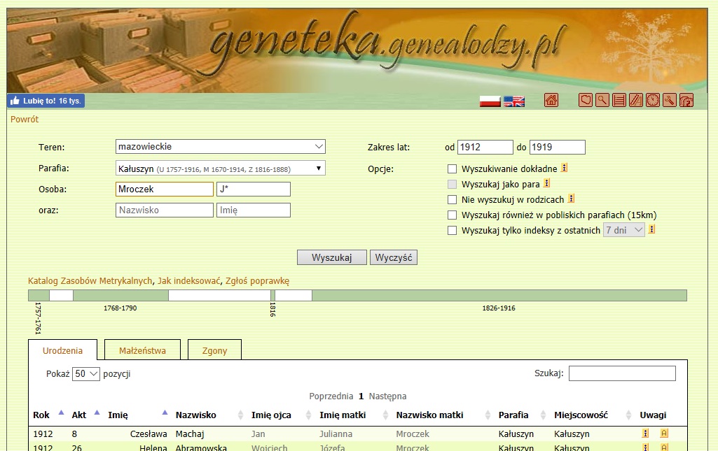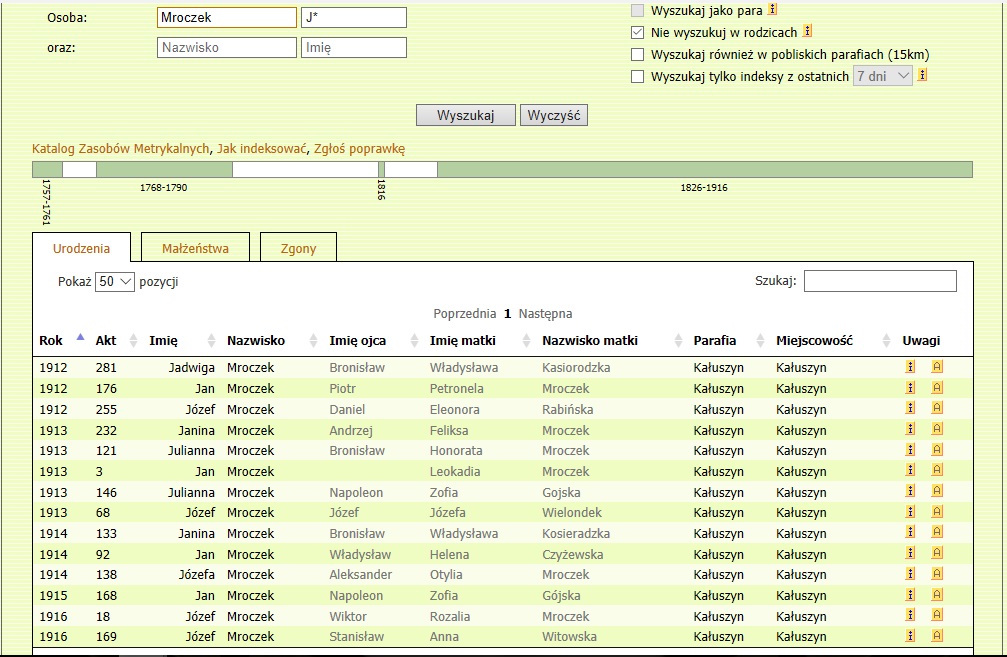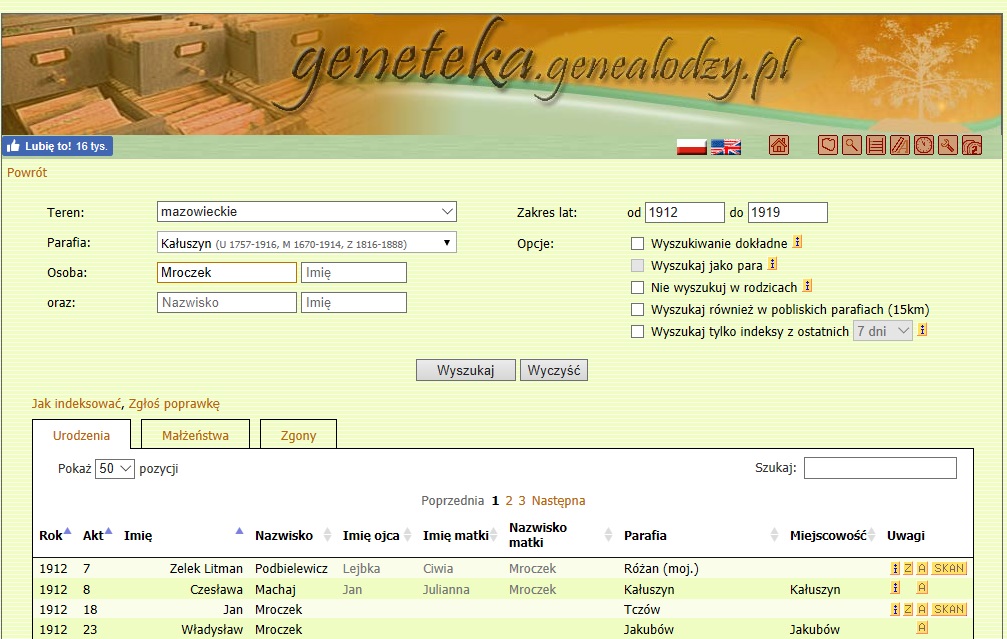 Aby sprawdzić jej działanie, posłużmy się przykładem J. Mroczka, ucznia siedmioklasowej szkoły powszechnej z Kałuszyna. Niestety z powodu braku imienia nie możemy stwierdzić, czy uczeń jest chłopcem, czy dziewczynką. Wiemy jedynie, że urodził się pomiędzy 1912 a 1919 rokiem. Aby go odszukać, najlepiej wejść w zakładkę „Geneszukacz” i w wyszukiwarce wpisać nazwisko oraz zakres dat. Otrzymamy 455 wyników. Kałuszyn leży w województwie mazowieckim, przejdźmy więc do aktów urodzeń z tego obszaru, co pozwoli nam zawęzić liczbę wyników do 146.