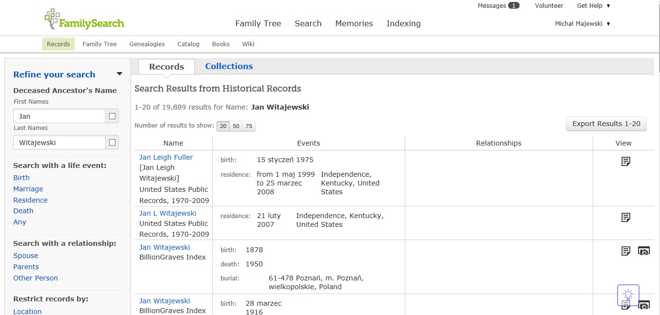 Opisując ten zasób poszukiwałem informacji o Janie Witajewskim ze Szkoły Powszechnej nr 11 w Poznaniu, który złożył podpis w Polskiej Deklaracji o Podziwie i Przyjaźni dla Stanów Zjednoczonych. Po wpisaniu jego imienia i nazwiska w wyszukiwarce otrzymałem 19 889 rekordy. Sprawdźmy na tym przykładzie, jak działa baza FamilySearch. Wpiszmy w wyszukiwarkę „Jan” „Witajewski”. W wynikach wyszukiwania znalazły się różne nazwiska o podobnym brzmieniu, np. Witajewski, Witkowski, Wichrowski, Wojtkowski i wiele innych. Aby ograniczyć działanie soundexów, czyli algorytmów uwzględniających odmienne formy imion i nazwisk, należy kliknąć w okienko po prawej stronie belki wyszukiwarki. Spowoduje to zawężenie liczby wyników. Tej metody zazwyczaj nie polecam, chyba że szukamy kogoś, kto ma bardzo charakterystyczne nazwisko. Pamiętajmy, że to samo nazwisko w różnych okresach historycznych i w różnych regionach geograficznych można było zapisywać na wiele sposobów. Przykładowo nazwisko „Majewski” mogło wyglądać następująco: Majewski, Maiewski, Majevski, Majevsky, Maievski. Można było je również spotkać bez litery „w” w ostatniej sylabie. Jeszcze na początku XIX wieku rzadko stosowano „w” przed sylabą „ski”. Tak więc nigdy nie możemy być pewni właściwego zapisu nazwiska.