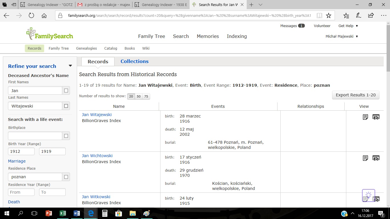 Z powyższego powodu polecam raczej zawężanie wyników poprzez dodawanie dodatkowych informacji, a nie poprzez wyłączanie soundexów. W przypadku Jana Witajewskiego możemy wpisać „Poznań” jako miejsce jego pobytu. Tym sposobem zawęzimy wyszukiwanie do kilkuset osób, mając pewność, że przeszukamy również rekordy zawierające inne sposoby zapisu imienia i nazwiska, nie pomijając ważnych dla nas rekordów. Po dodaniu kolejnego czynnika, jakim może być zakres dat, pomiędzy którymi urodził się Jan Witajewski, pozostanie nam jedynie 19 rekordów.