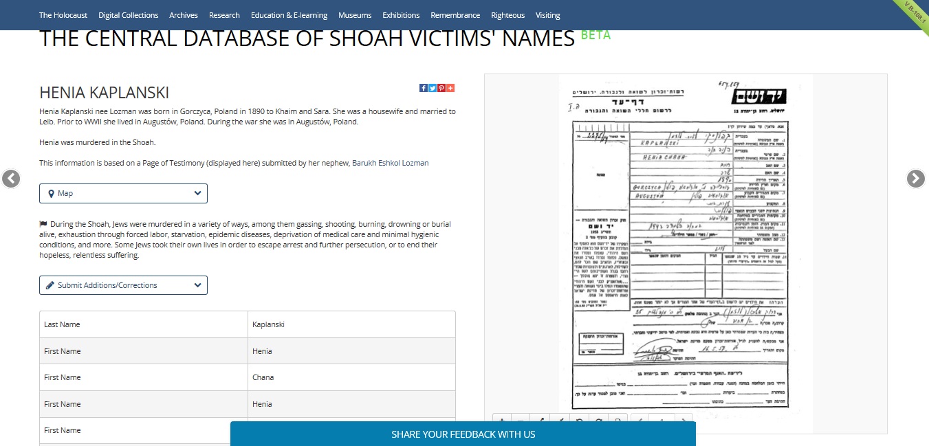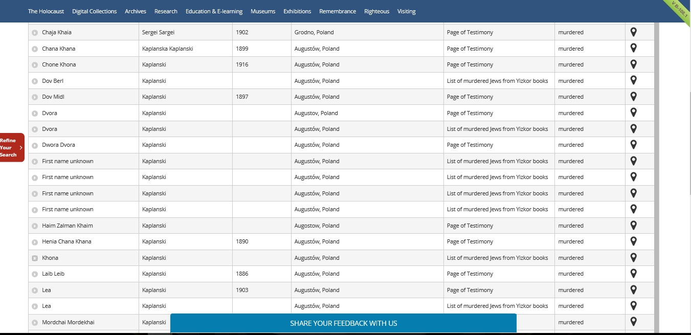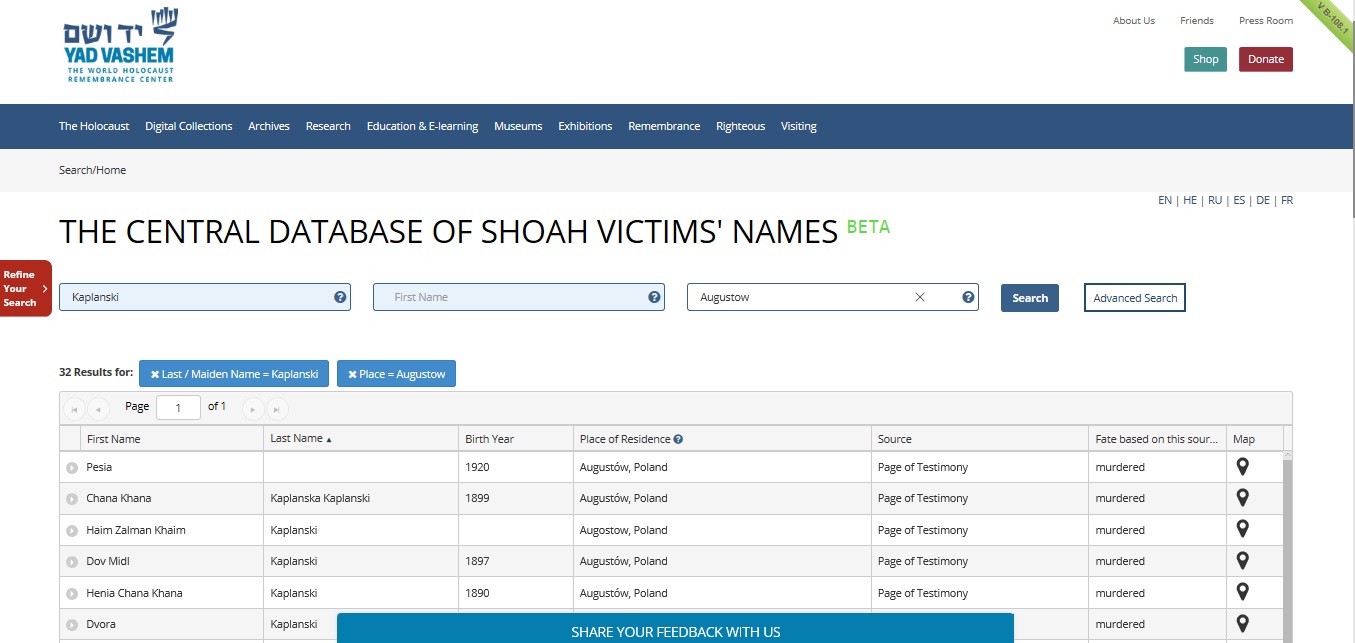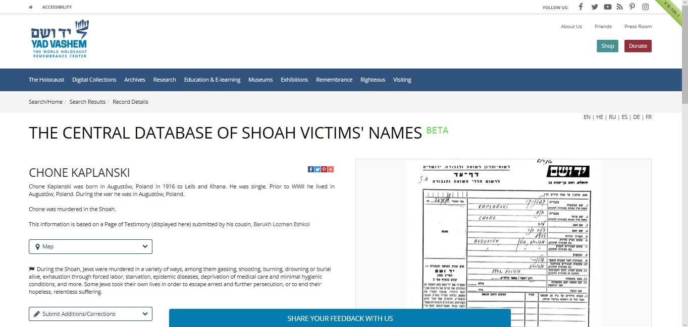 Baza wykorzystuje angielską transkrypcję imion i nazwisk, dlatego dane mogą być zapisane w inny sposób niż ten, którego szukamy. Z tego powodu Chone Kapłański występuje na liście dwa razy. Raz jako „Chone vel Khona Kapłański”, drugi raz jako „Khona Kapłański”. Pierwszy wpis pochodzi z Karty Świadectwa, drugi z tzw. Księgi Pamięci, czyli książki upamiętniającej daną społeczność. Skupmy się na Karcie Świadectwa, która choć nie jest oficjalnym dokumentem, zawiera pełniejsze dane niż wiele innych materiałów. Po otwarciu karty klikamy opcję „More details”. Tu będziemy mogli przeczytać bardziej szczegółowe informacje. Zgodnie z nimi Chone Kapłański urodził się w Augustowie w 1916 r. Był synem Leiba i Heni Kapłańskich. Został zamordowany w 1942 r. w Augustowie. Dodatkową ważną informacją jest fakt, że jego zgon został po wojnie zarejestrowany przez Barucha Lozmana vel Eshkol, jego kuzyna. Dzięki tej informacji możemy sprawdzić za pomocą wyszukiwarki zaawansowanej, kogo jeszcze zarejestrował Baruch Lozman vel Eskhol. Okazuje się, że przekazał on do Yad Vashem informacje o 29 mieszkańcach Augustowa zamordowanych w czasie II wojny światowej. Na próbę skupmy się tylko na zarejestrowanej przez niego rodzinie Kapłańskich. Na liście znajdziemy m.in. informacje o matce Chonego, Heni Kapłańskiej. Urodziła się ona w Gorczycy w 1890 r., jako córka Chaima i Sary Lomazów. Oznacza to, że była siostrą ojca Barucha Lozmana. Jest tam również informacja na temat Altera Kapłańskiego urodzonego w 1918 r., a także Sary Soni Kapłańskiej, młodszego rodzeństwa Chonego. Gdybyśmy przeanalizowali wszelkie wpisy, mielibyśmy szansę zbudować małe drzewo genealogiczne Chonego Kapłańskiego.