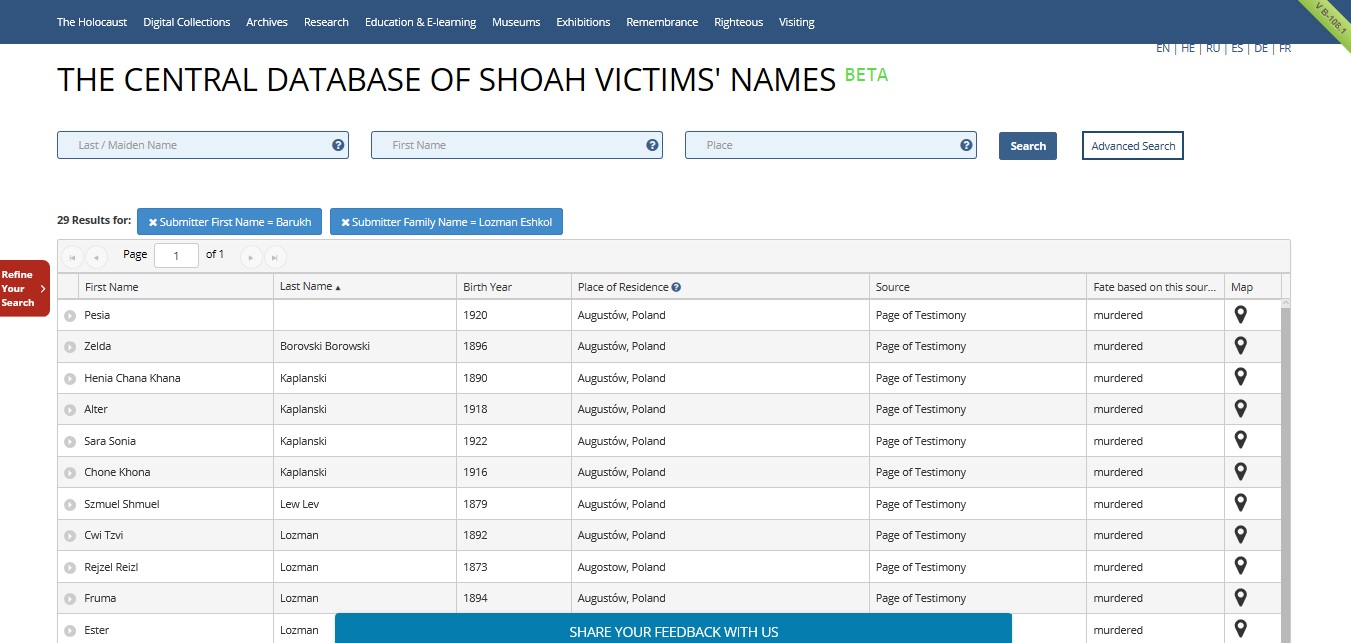 Baza ofiar Zagłady jest dostępna na stronie instytutu Yad Vashem pod linkiem: http://yvng.yadvashem.org. Zawiera ona dwie wyszukiwarki: prostą i zaawansowaną. Prosta wyszukiwarka jest naprawdę efektywna. Wystarczy wpisać nazwisko, imię lub miejscowość, by otrzymać wiele trafnych rekordów. Aby zrozumieć zasady jej funkcjonowania, trzeba pamiętać, że na Kartach Świadectw znajdują się nie tylko informacje o jednej osobie, ale też o jej rodzicach i bliskich, a ponadto o wielu miejscach pobytu ofiary. Z tego powodu wyszukiwarka przeszukuje nie tylko jedno pole z imieniem ofiary, ale wszystkie pola karty, w których mogą być wpisane imiona. To samo tyczy się nazwisk i nazw miejscowości.