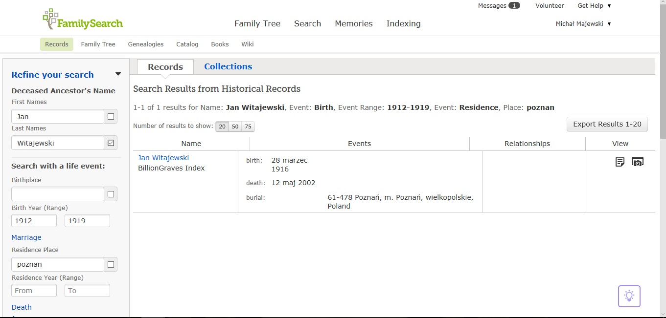 Na pierwszym miejscu wyświetlił się nam rekord, który najbardziej pasuje do wpisanych przez nas parametrów. Jeżeli wyłączymy soundex poprzez kliknięcie w checkbox obok wyszukiwania nazwiska, zawęzimy wyszukiwanie tylko do osób, których nazwisko brzmi „Witajewski” i jest ono zapisane dokładnie w ten sposób. Jest to informacja dotycząca grobu Jana Witajewskiego, który zmarł 12 maja 2002 roku i jest pochowany w Poznaniu na cmentarzu parafialnym Bożego Ciała. Zgodnie z informacjami, które znalazły się na jego pomniku, urodził się on 28 marca 1916 r. Wszystkie te dane pozwalają przypuszczać, że jest to ta sama osoba, której podpis znalazł się w Deklaracji z 1926 r.