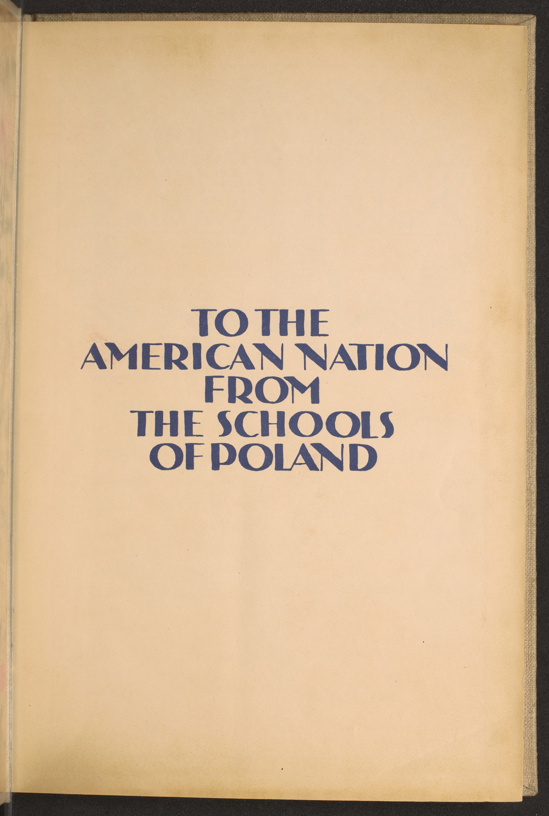tytułowa strona; napis: "TO THE AMERICAN NATION FROM THE SCHOOLS OF POLAND" [DLA NARODU AMERYKAŃSKIEGO OD POLSKICH SZKÓŁ]