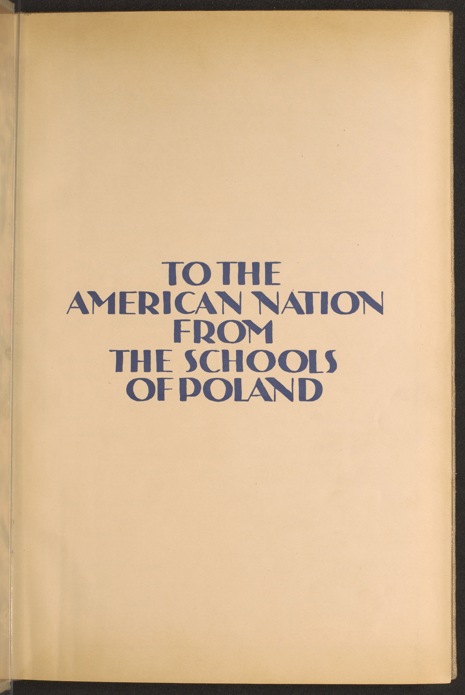 tytułowa strona; napis: "TO THE AMERICAN NATION FROM THE SCHOOLS OF POLAND" [DLA NARODU AMERYKAŃSKIEGO OD POLSKICH SZKÓŁ]