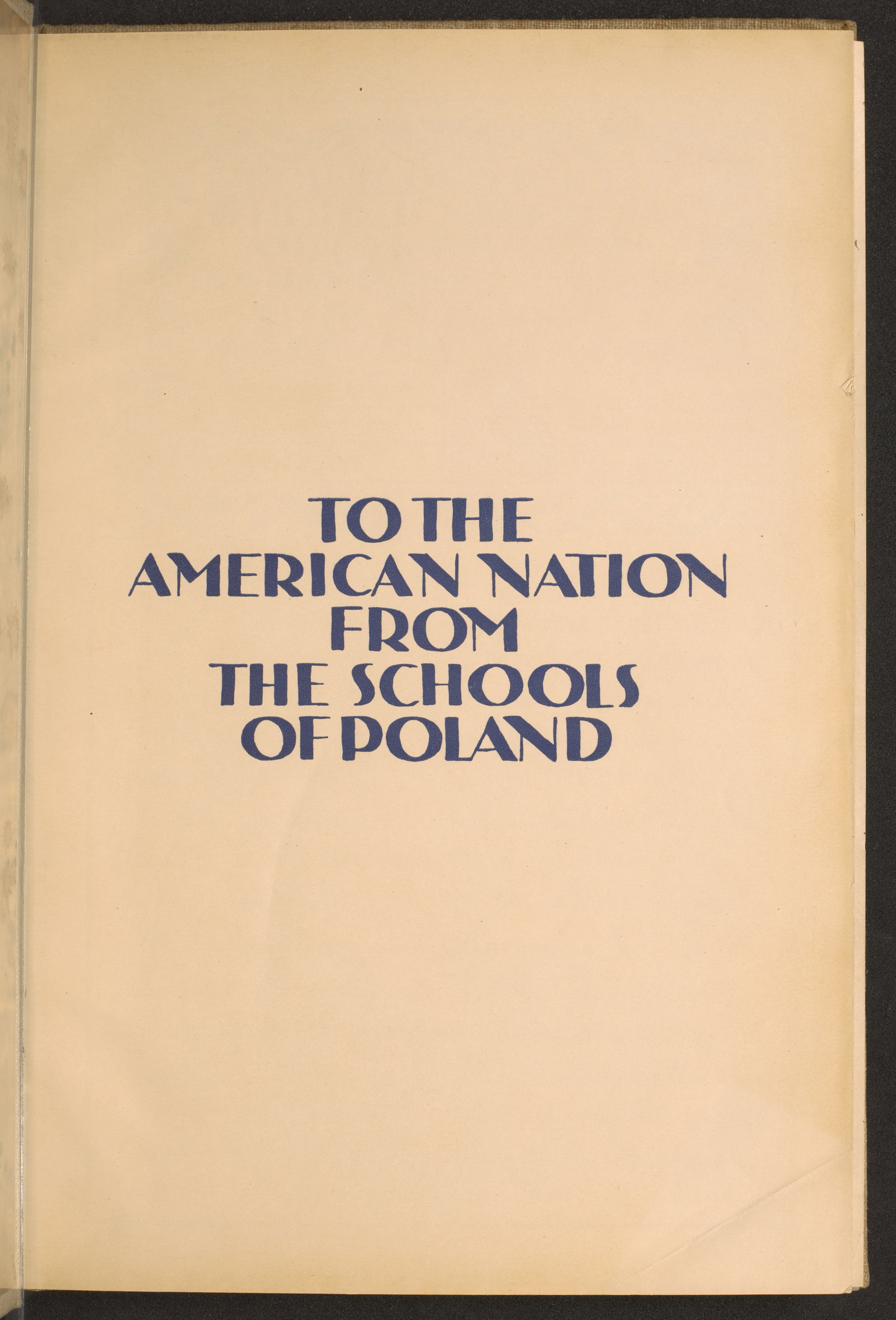 tytułowa strona; napis: "TO THE AMERICAN NATION FROM THE SCHOOLS OF POLAND" [DLA NARODU AMERYKAŃSKIEGO OD POLSKICH SZKÓŁ]