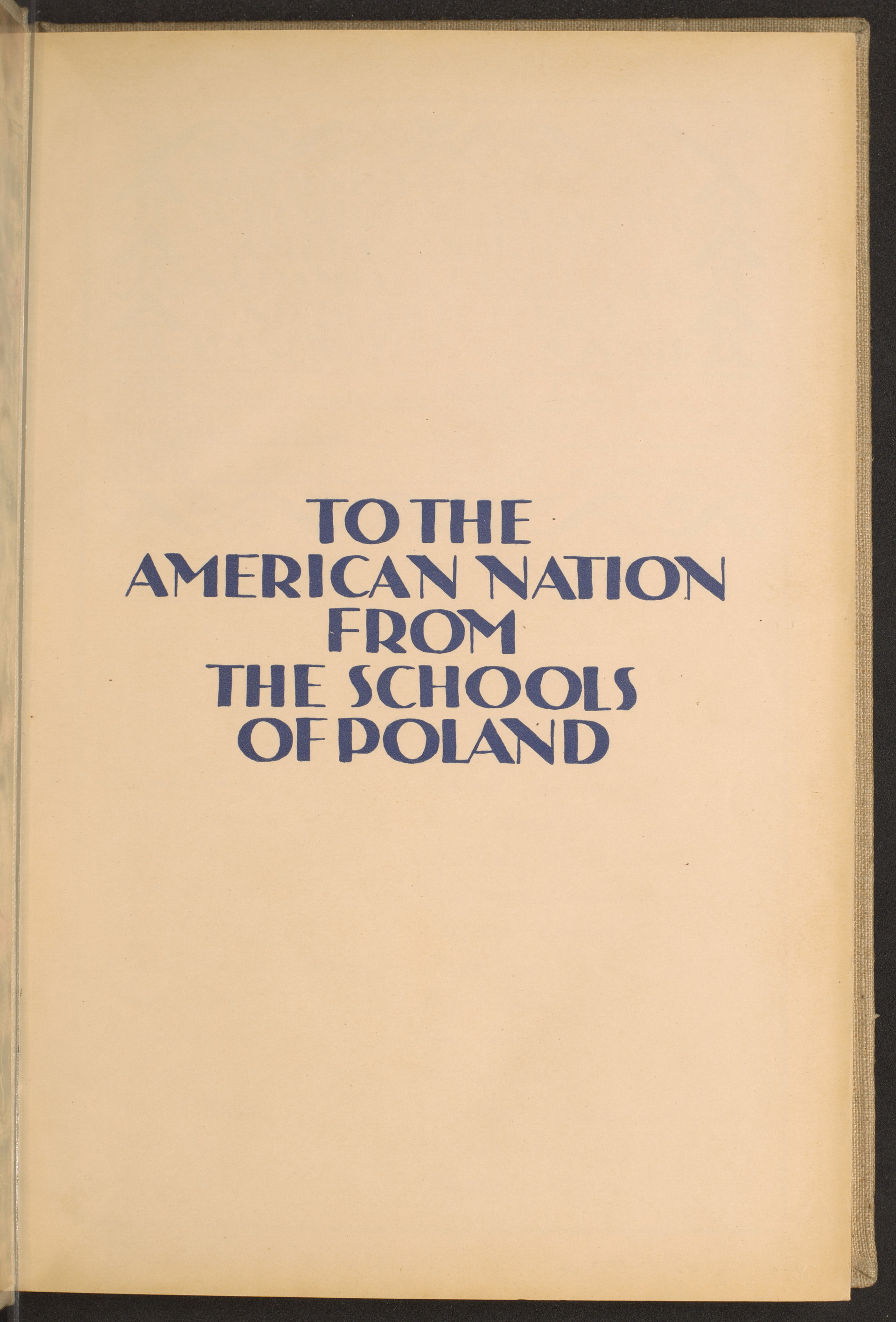 tytułowa strona; napis: "TO THE AMERICAN NATION FROM THE SCHOOLS OF POLAND" [DLA NARODU AMERYKAŃSKIEGO OD POLSKICH SZKÓŁ]