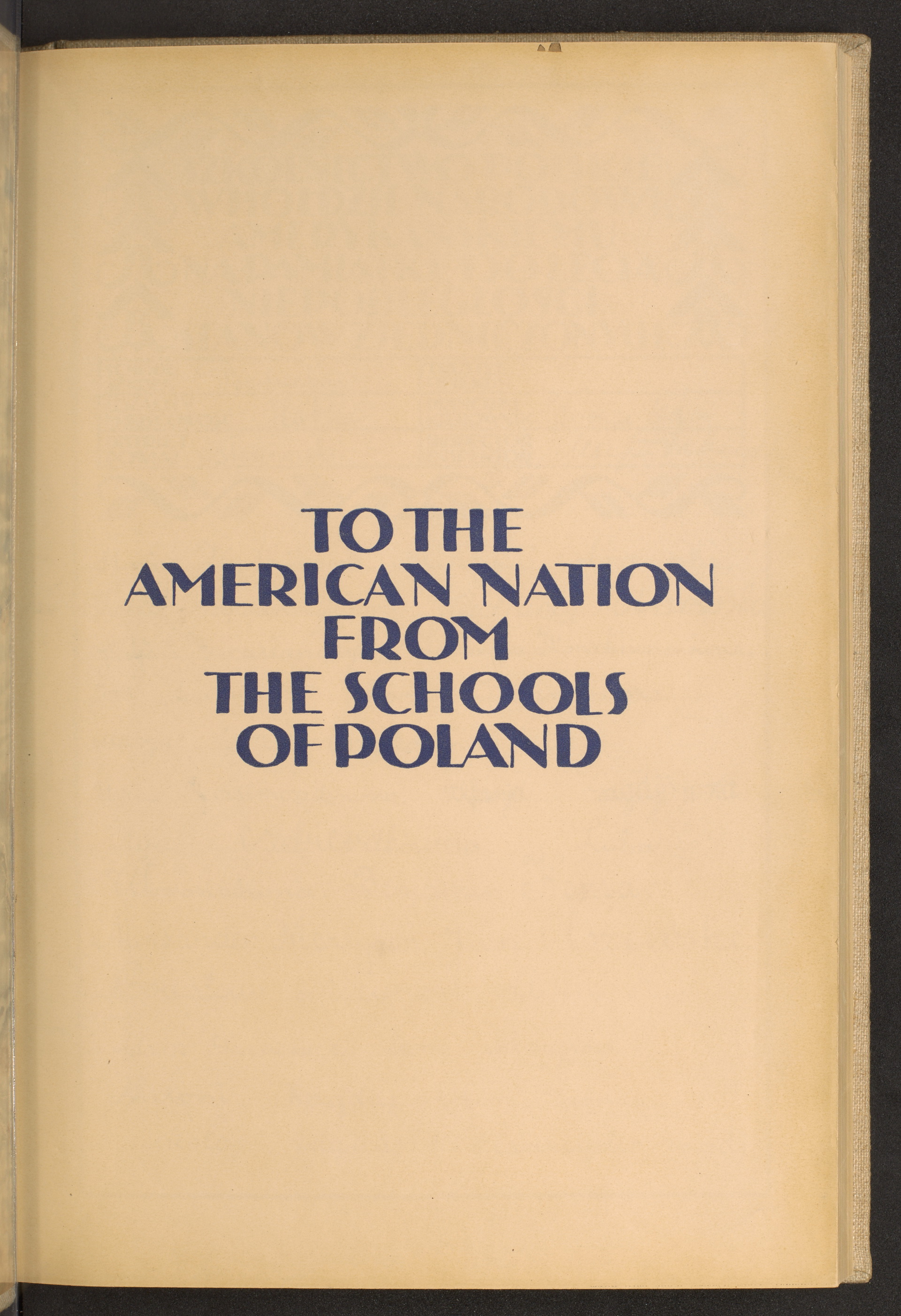 tytułowa strona; napis: "TO THE AMERICAN NATION FROM THE SCHOOLS OF POLAND" [DLA NARODU AMERYKAŃSKIEGO OD POLSKICH SZKÓŁ]