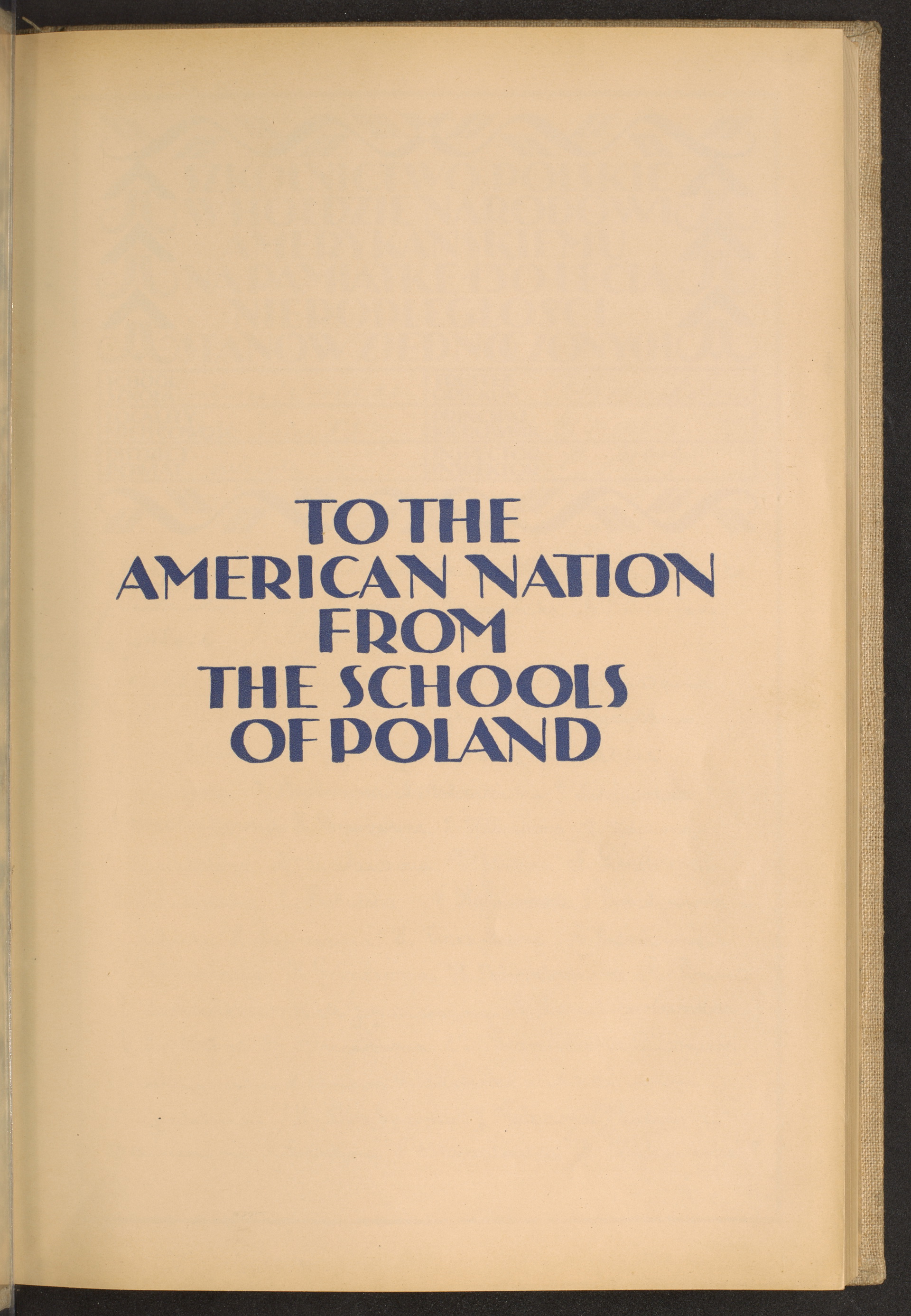 tytułowa strona; napis: "TO THE AMERICAN NATION FROM THE SCHOOLS OF POLAND" [DLA NARODU AMERYKAŃSKIEGO OD POLSKICH SZKÓŁ]