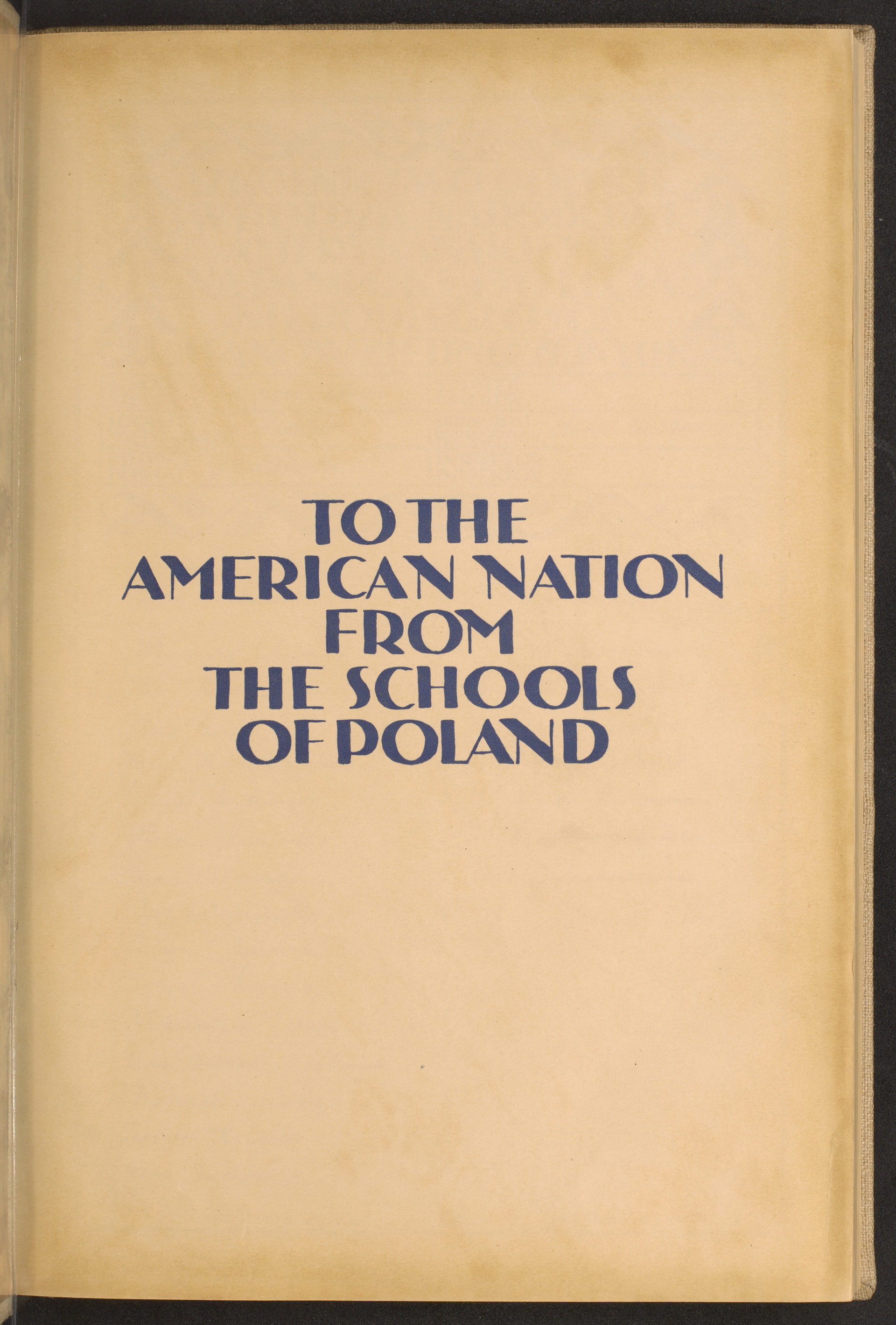 tytułowa strona; napis: "TO THE AMERICAN NATION FROM THE SCHOOLS OF POLAND" [DLA NARODU AMERYKAŃSKIEGO OD POLSKICH SZKÓŁ]