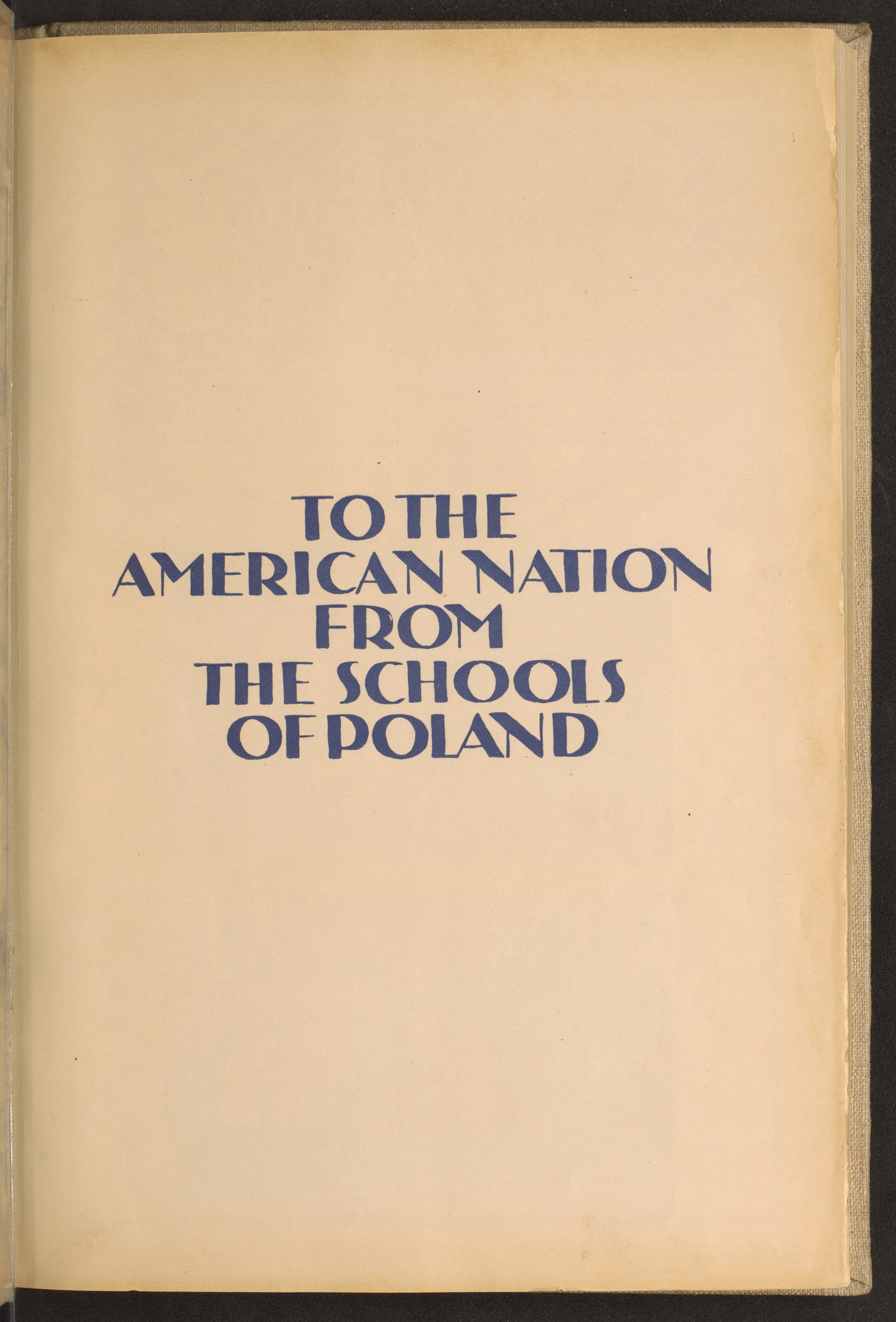 tytułowa strona; napis: "TO THE AMERICAN NATION FROM THE SCHOOLS OF POLAND" [DLA NARODU AMERYKAŃSKIEGO OD POLSKICH SZKÓŁ]