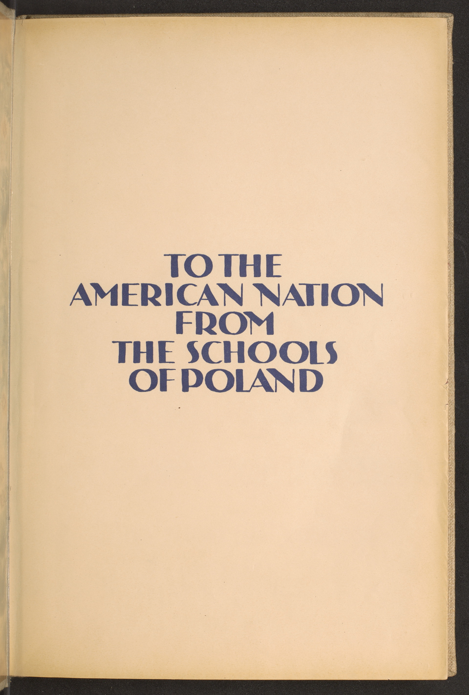 tytułowa strona; napis: "TO THE AMERICAN NATION FROM THE SCHOOLS OF POLAND" [DLA NARODU AMERYKAŃSKIEGO OD POLSKICH SZKÓŁ]