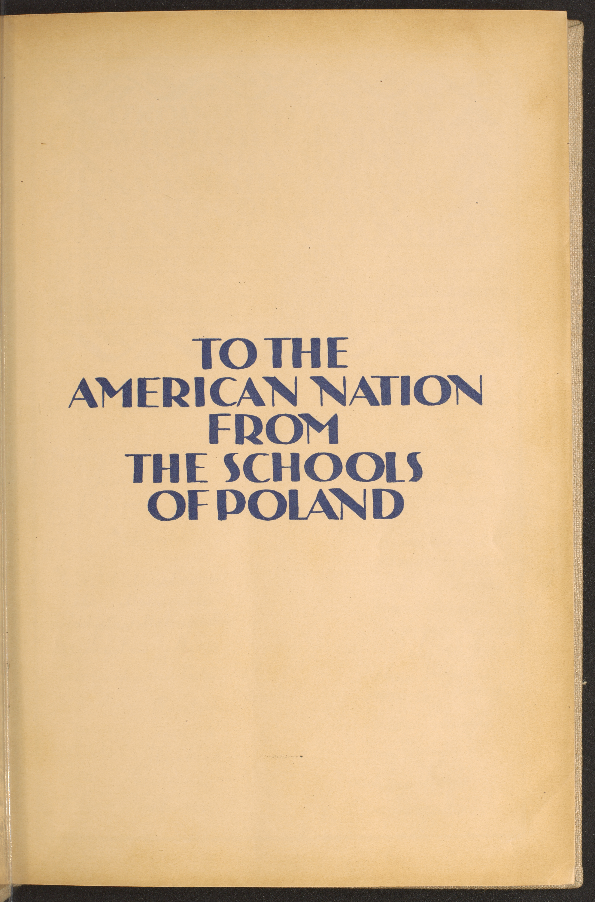 tytułowa strona; napis: "TO THE AMERICAN NATION FROM THE SCHOOLS OF POLAND" [DLA NARODU AMERYKAŃSKIEGO OD POLSKICH SZKÓŁ]