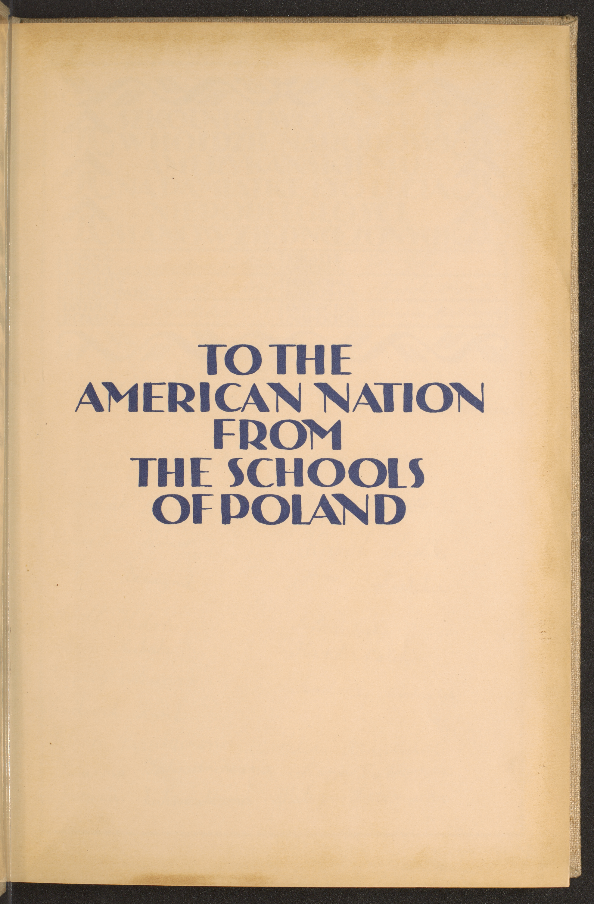 tytułowa strona; napis: "TO THE AMERICAN NATION FROM THE SCHOOLS OF POLAND" [DLA NARODU AMERYKAŃSKIEGO OD POLSKICH SZKÓŁ]