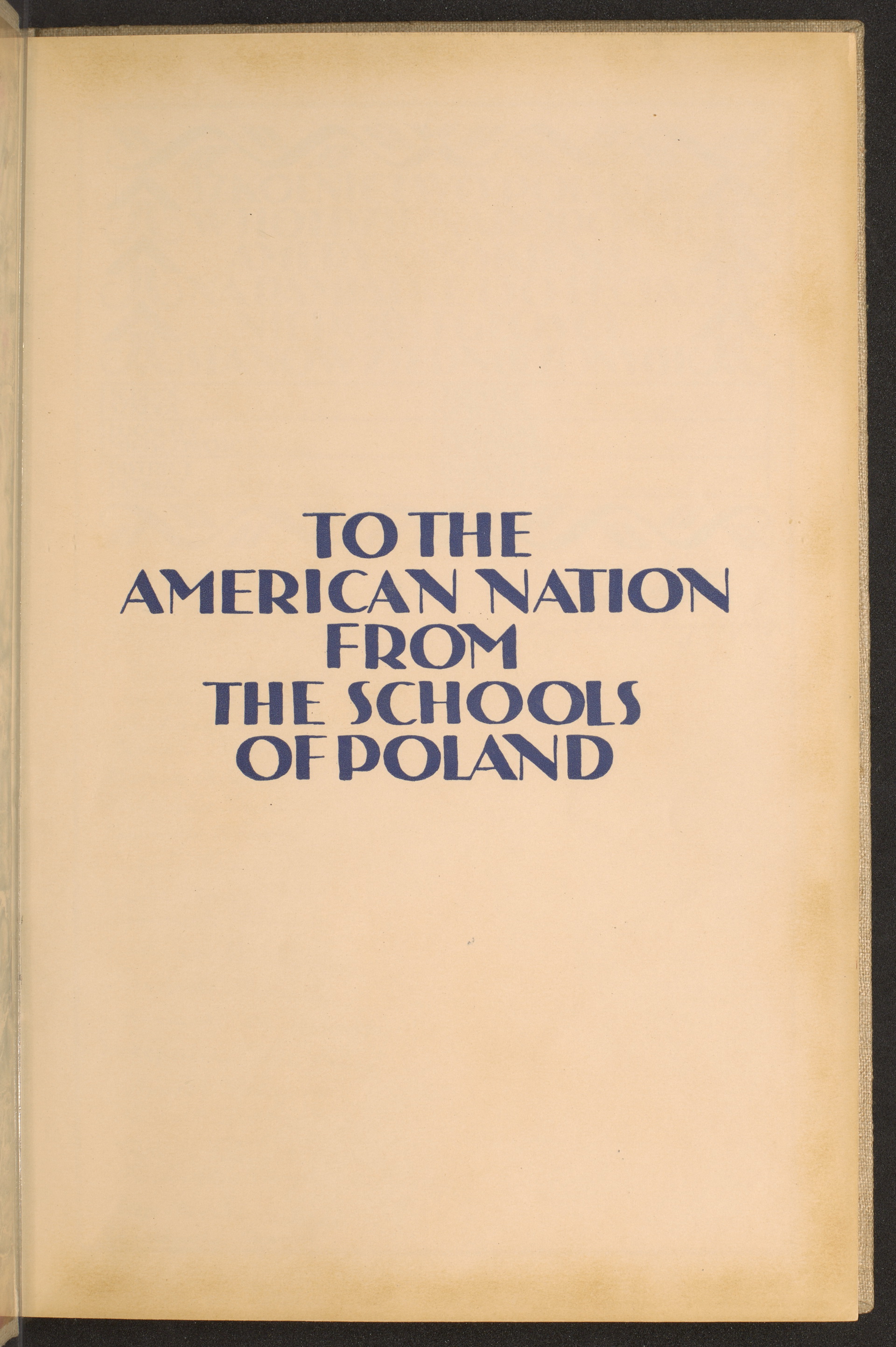 tytułowa strona; napis: "TO THE AMERICAN NATION FROM THE SCHOOLS OF POLAND" [DLA NARODU AMERYKAŃSKIEGO OD POLSKICH SZKÓŁ]