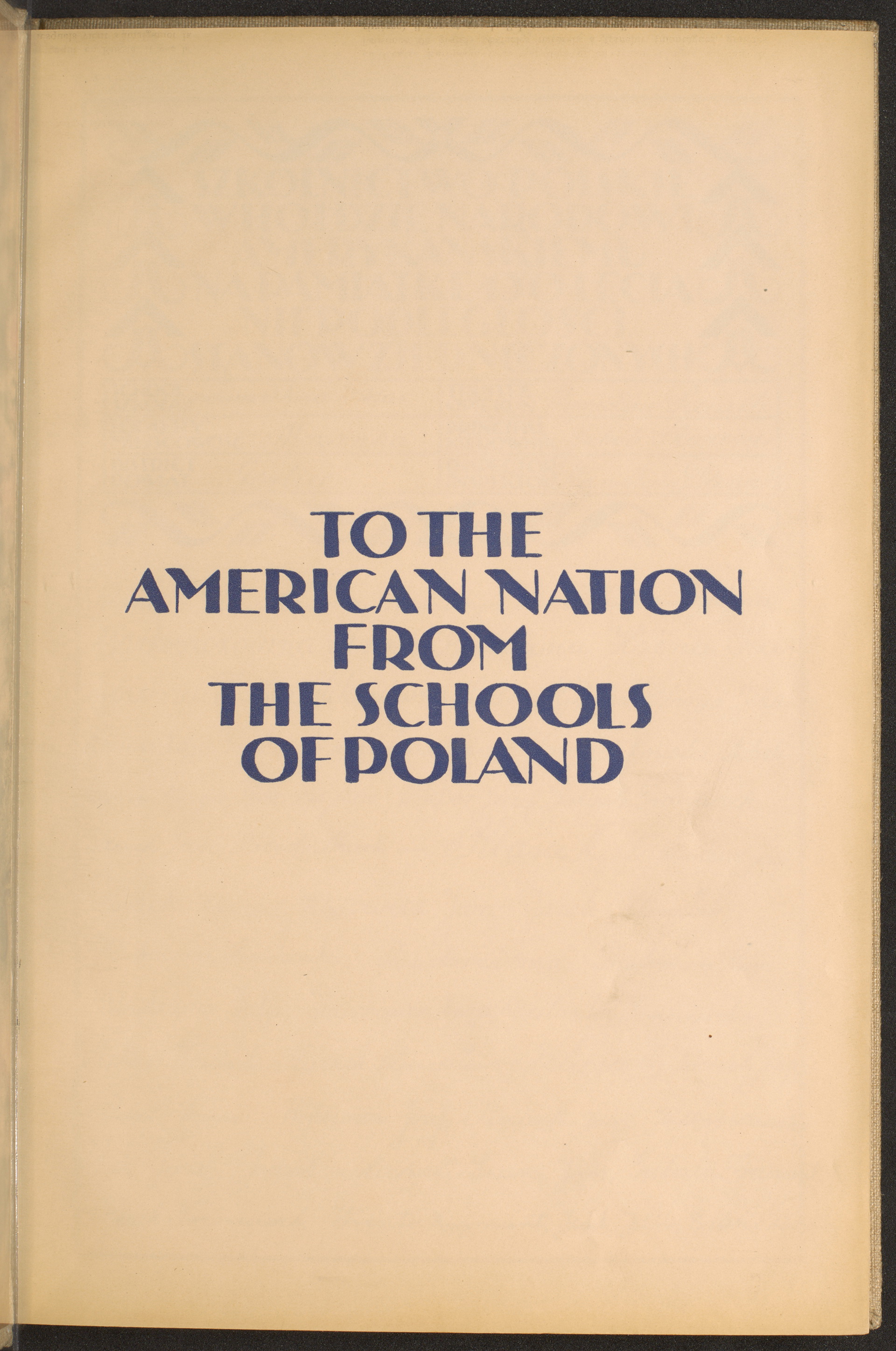 tytułowa strona; napis: "TO THE AMERICAN NATION FROM THE SCHOOLS OF POLAND" [DLA NARODU AMERYKAŃSKIEGO OD POLSKICH SZKÓŁ]