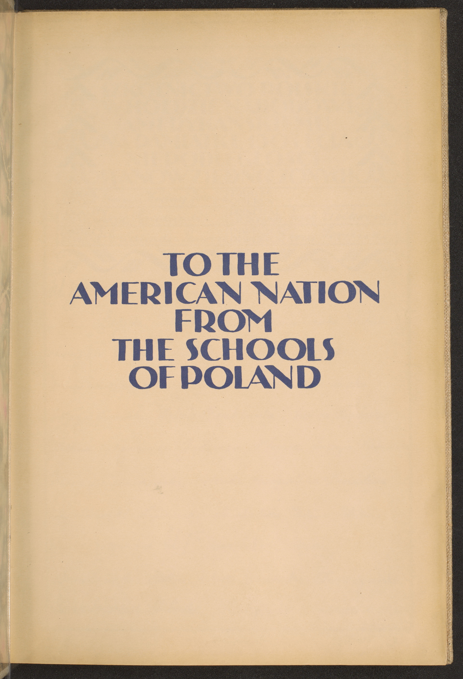 tytułowa strona; napis: "TO THE AMERICAN NATION FROM THE SCHOOLS OF POLAND" [DLA NARODU AMERYKAŃSKIEGO OD POLSKICH SZKÓŁ]