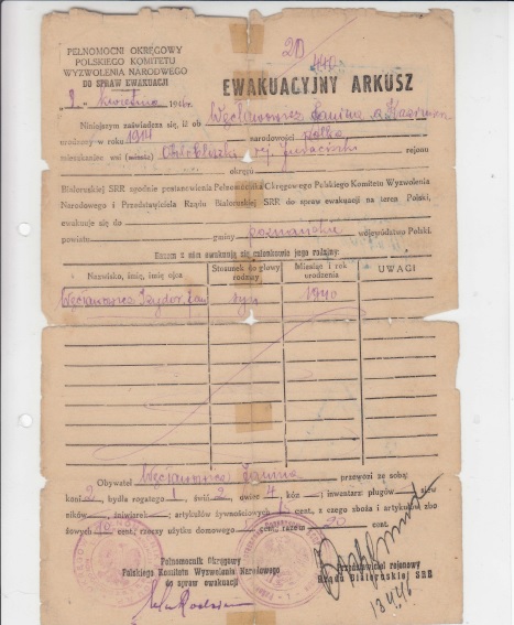 Z chwilą powstania możliwości repatriacji w marcu 1946 roku razem z dwoma Siostrami, które były na swoich gospodarstwach przy pomocy łapówek (w roku 1946 wiosną w ZSRR panował potworny głód więc mięso, tytoń i bimber były najbardziej cennym walorem) w Urzędach Sowieckich tak przyśpieszyły wydanie dokumentów, że w połowie kwietnia porzucając gospodarstwa załadowały się na wagony pociągu repatriacyjnego na stacji Juraciszki.